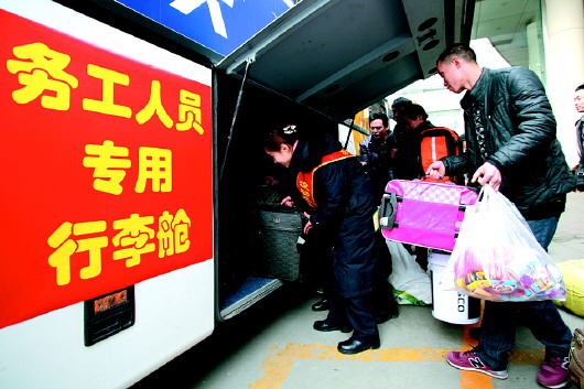 2日15时,济南长途汽车总站“务工人员专用行李舱”启动仪式正式开始,随着汉中班车缓缓驶入总站,全国首个“务工人员专用行李舱”亮相。 本报记者 宋磊 通讯员 尚虹 摄
