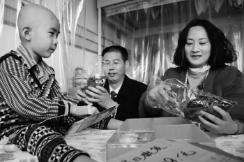 翘楚因为放化疗药量太大,有的地方的头发已经脱落,刘先生亲昵地摸着翘楚的小脑袋,鼓励地说“加油儿子,不要辜负叔叔阿姨对你的帮助!”