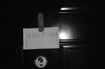 2日下午,记者来到位于圣荣广场西侧的圣荣商务楼C座,在商务楼四楼,记者看到公厕已经停用,门上用创可贴粘着一张字条,提醒业户如厕上五楼。