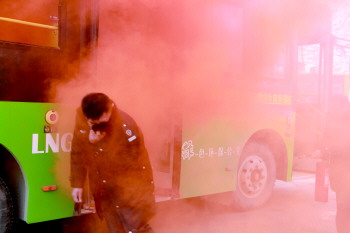 2日上午,菏泽市公共汽车公司开展了现场消防演练,8名驾驶员参与了演练,200余名驾驶员现场观摩。当日下午,37路驾驶员何伟国“现学现用”,驾驶公交行驶至市中心血站时,恰遇到一辆摩托三轮车着火,何伟国当即取下车上灭火器,将火扑灭。图为:菏泽市公共汽车公司消防演练现场。 本报记者 姚楠 通讯员 张聪 摄影报道