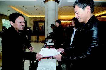 政协委员周广存向工作人员提交提案。本报记者 邓兴宇 摄