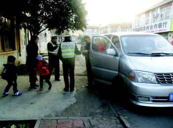2014年12月,城阳区一辆面包车因非法接送学生,被交警部门查获并处以1万元罚款。(资料片)
