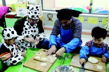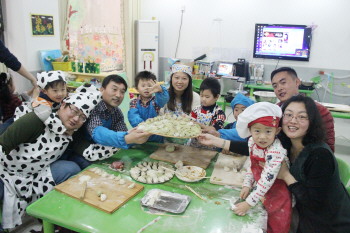 日前,在胶州市机关幼儿园阳关分园,小朋友们和爸爸戴上头巾、系上围裙,一起动手包水饺。春节快到了,幼儿园组织孩子们学习包饺子、做家务,提高动手能力。