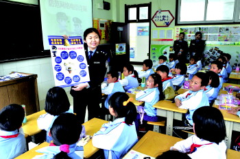 民警向小学生宣传电信诈骗的手法和危害。 通讯员 王猛 摄
