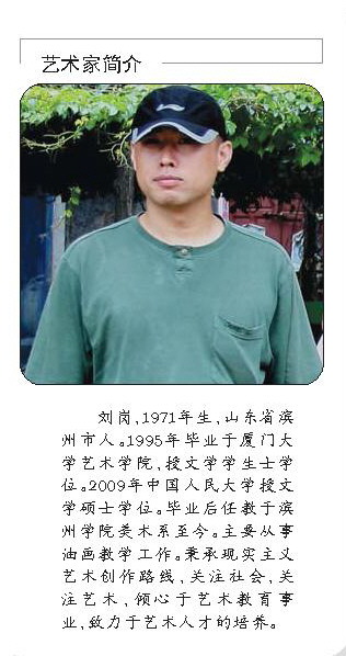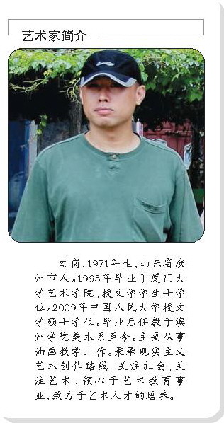 刘岗,1971年生,山东省滨州市人。1995年毕业于厦门大学艺术学院,授文学学生士学位。2009年中国人民大学授文学硕士学位。毕业后任教于滨州学院美术系至今。主要从事油画教学工作。秉承现实主义艺术创作路线,关注社会,关注艺术,倾心于艺术教育事业,致力于艺术人才的培养。