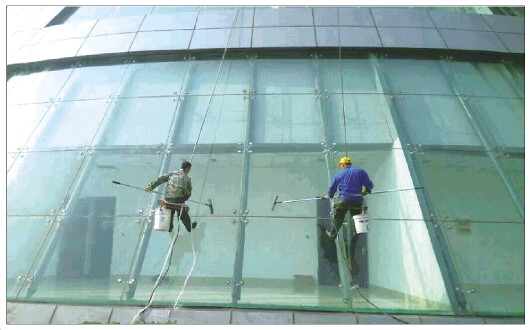 “最危险的还是从高层建筑物上面固定绳索后刚坐到座板上那一刻,刚开始做这一行时也是吓得心惊胆战的。”卢师傅说,他接过最大的活楼层有50多层,在100多米高的建筑上“飞檐走壁”,清洁玻璃。他们要将水桶、刮刀、清洁剂等物品随身携带,一只手抓住绳索,另一只手作业,双脚也要不停地蹬住墙体以固定位置,工作难度和强度都要比普通保洁员大得多,因此大多数从事这个行业的都是45岁以下的青壮年。卢师傅告诉记者,每年“五一”和“十一”前后是高空作业的黄金时期,但如果酷暑和严冬有需要时,他们也会去工作。“夏天玻璃墙面的温度能达到40多摄氏度,冬天最冷时,墙面刚被打湿可能就结冰了,因此干这份活一定要动作麻利。”卢师傅说,他们常常以“吊”记工作量,从最高层顺着绳索往下清洁,一直到地面,就是一“吊”,一“吊”的擦洗宽度在2米以内。一般高楼在20层左右,卢师傅和工友们工作时每天平均要干4吊到6吊的活,他们每天能赚350元左右,比普通保洁员高出不少。