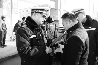 交警在对一名司机进行酒精检测。 本报记者 张冬梅 摄