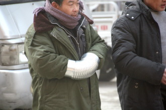 时间:2015年1月25日 自述:这位大哥将取暖炉上的烟囱弯脖套在手上。 点评:既轻便又挡风,一举两得。