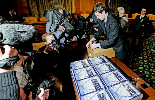 2日,在美国华盛顿,记者围拍印制成册的美国政府2016年财政预算案。