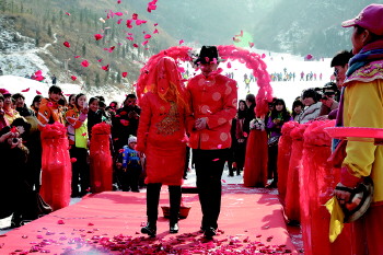 亮点三是尊享山珍喜宴,并赠送私人订制价值536元的情侣滑雪卡。成亲仪式结束后,金象山将在三星级宴厅为新人举办热闹的“婚宴”。届时,新人们在彼此的祝福下品尝独具特色的生态盛宴!同时每一对前来参加此次成亲仪式的“新人”都将获得金象山滑雪场为您私人订制的价值536元的精美情侣滑雪卡一张。 (郭斐)