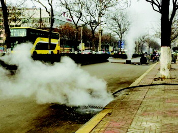 随即,记者来到位于济安桥路长安花园小区门前。只见一处供暖井盖内不断冒出白色蒸汽。蒸汽高约3米左右,如同舞台上干冰制成的烟雾一样。在距离蒸汽源2米远处,仍能感到蒸汽的温度。用手触摸地表的温度,有明显热感,在距离热力井盖不远的两处井篦子也不断有白气喷出。