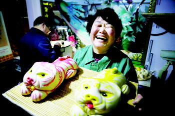 提到面塑,不得不提烟台王爱学夫妇,今年五十多岁的夫妇两人研究制作面塑十年,做出的饽饽经过色彩的点缀栩栩如生,馒头上的一花一草,一鸟一兽都有模有样。