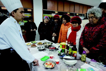 2日,在民生街社区,厨师正在教社区居民做菜。春节临近,为了让社区居民学做更营养丰富的菜肴,社区请来厨师现场为居民讲解菜的烹饪方法。