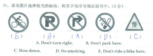 下午,记者来到滨城区第一小学,跟着六年级的学生参加了一场英语考试,考试时间为一个小时。开考半个小时,不少学生就已经做完,但记者还在奋笔疾书,考试结束后将试卷与答案对比,没有得到满分,很是遗憾。而在六年级的英语题中,一道关于识别标示牌的题目,贴近生活,将常见的标示用英语表达,是需要一定得生活常识的。