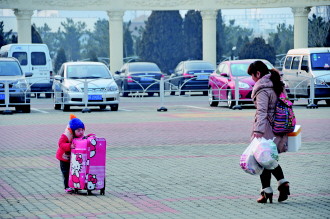 3日上午,威海市火车站,一名儿童推着一个行李箱和母亲赶火车。2015年春运将于2月4日开始至3月16日结束。