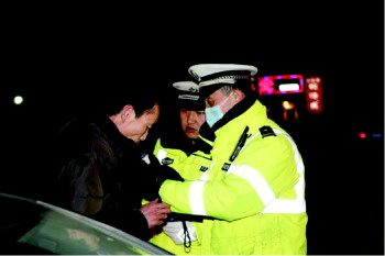 交警用酒精检测仪检查驾驶员是否酒驾。