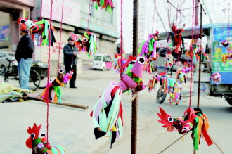 在马庄市场路边,一位商贩将手工缝制的打春鸡挂在架子上售卖。 本报记者 杨霄 摄
