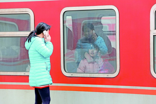 4日上午10时40分,在青岛火车站,青岛开往西安的K1027列车即将离站,姐姐隔着车窗打电话给妹妹最后嘱托。昨天是2015年春运首日,济南铁路局当天发送旅客约20万人次,与去年相比略有下降。济南铁路局客运处相关负责人介绍,由于今年春运较去年迟来约20天,学生流已发送了九成以上,务工流又比较分散,因此春运首日比较平稳。今年春运至3月15日结束,共计40天。 本报记者 张晓鹏 摄影报道