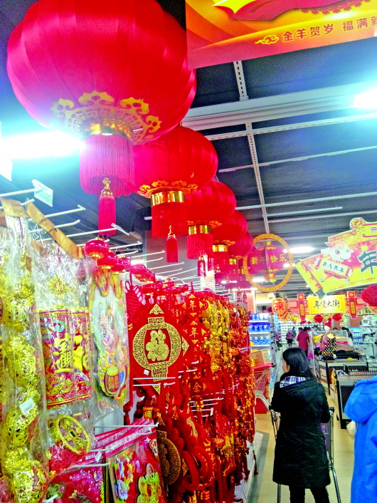 商河的几家超市货架上悬挂的中国结。 本报见习记者 刘慧 摄