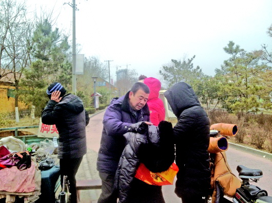一个修鞋机器、一张桌子、两个小板凳、一辆堆满杂物的电动车和一盒散落分布的拉链,就是于希良全部的家当,他的小摊设在胡同口上,四处没有遮挡,小摊周围也没有任何防寒措施,风从四面八方吹向小摊。记者来时,他正坐在小板凳上修鞋,腿上盖了一件破棉袄。雪后的商河气温有点低,大街上闲逛的人比平时要少得多,于希良的小摊上却挤满了顾客。粗略一数,有七八名顾客在等待着。