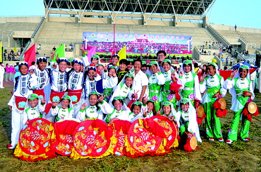 鼓子秧歌在少数民族传统体育运动会上获得银奖。 (资料片)