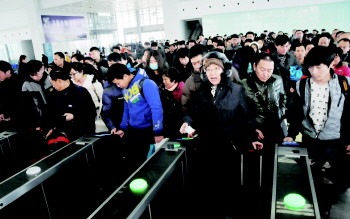 4日,烟台站终于迎来动车,拉开了春运大幕,为动车专用的东候车室内旅客们正在检票。 本报记者 李泊静 摄