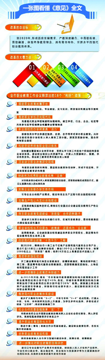 4日,市教育局解读市政府印发的《关于加快发展现代职业教育的意见》内容。为适应青岛市十条工业千亿级产业链对于高素质技能型人才的需求,《意见》提出,在青岛市开展职业教育“四统筹”“双名牌”和“现代技能人才培养工程”的基础上,实施现代职业教育“十百千万”工程。到2020年,围绕全市十条工业千亿级产业链和现代服务业主导产业,重点打造10所以上具有鲜明青岛特色、适应产业发展需求的品牌职业院校;建设100个以上内涵丰富、辐射能力强的市级骨干专业;培育1000名以上产学研能力较强的“双师型”教师;培养30万名以上具有良好职业道德、较高水平的高素质技术技能人才。