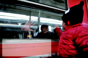 图为一位小朋友被妈妈托举着与姥姥姥爷隔着火车玻璃道别。