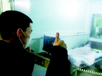 4日,小傅的父亲傅春良在无菌仓外探望自己的儿子,静待6日开始的移植手术。据悉,经过3年多的等待,父子配型成功,目前已达到移植条件。本报曾持续关注的白血病男孩小傅终于可以进行骨髓移植手术。6日、7日父子两人将共同躺上手术台进行移植手术,小傅身体有望恢复健康。 本报记者 谭文佳 摄影报道