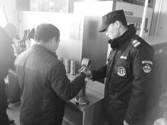 2月4日下午一点多,在枣庄西站安检口,一位妇女背着一个很大的尼龙袋等待检票,行李刚放到安检机上,一直紧盯电脑屏幕的安检员发现了问题:“袋子里是不是有金属制品,是饭盒吗,拿出来看一下。”听到安检人员招呼,和这名妇女同行的一名男子赶忙打开自己的尼龙袋。
