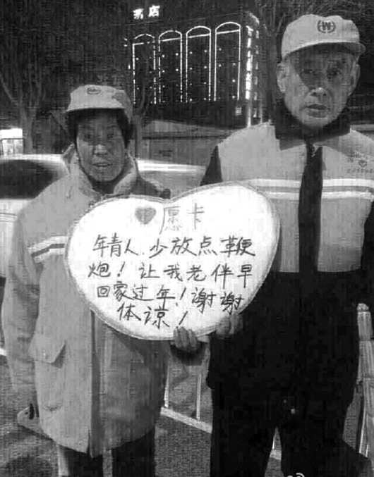 4日,一张呼吁少放鞭炮的图片在网络疯传,图片中的主人公是一对环卫工人夫妇,两人站在街头,手举一张心形卡片,上面写着“年青人,少放点鞭炮!让我老伴早回家过年!谢谢体谅!”