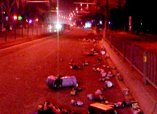 4日晚上11点半左右,一辆满载废品的货车由东向西行至经七路和谐广场附近时,捆绑废品的绳子意外绷断,导致满车废品几乎都抛撒在街上,驾驶员在车辆驶出一段后才发现。紧急停车后,驾驶员对眼前一幕目瞪口呆:大大小小的废品铺满邻近的三条车道,前后绵延近百米长。