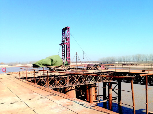 2月4日上午,记者来到了长清黄河大桥施工现场,临近年关,项目早已停工放假。记者在现场看到,大桥的施工便桥目前已全线贯通,由于放假停工,便桥上并没有施工人员,只停留了一辆重型机械车,部分机械设备被遮盖起来。据现场值班的工作人员介绍,施工便桥投资近4000万元人民币,位于大桥正下方,现用来为大桥主体打桩。“截至目前,整个工程已施工完成500多棵直径为1.8米的桩位,其中大桥主体的76个桩位已经完成了近一半。”一位值班人员告诉记者。