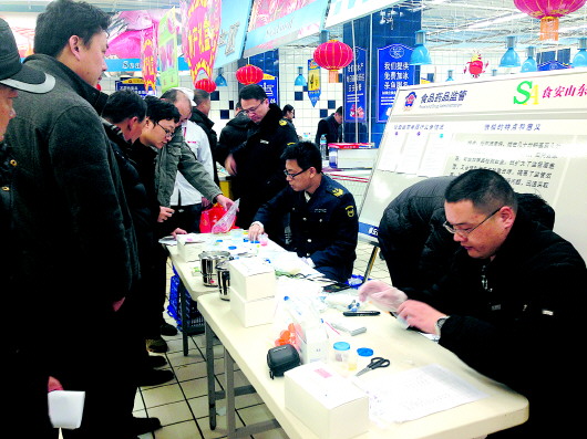 “这是干啥呢?”“给蔬菜做检验,看看有没有农药残留。”2月4日,在章丘大润发超市,章丘市食品药品监管局的工作人员使用快速检验设备,现场进行蔬菜、肉类等食品的抽样快检。据了解,从2日到6日,食药监局开展为期五天的“食品快检进市场”活动,确保春节期间食品安全。