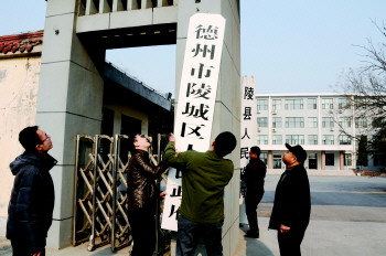 德州市陵城区政府门前,在市民的见证下进行换牌(资料片)。