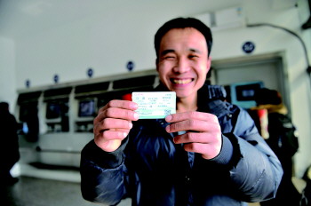 虽然买到回哈尔滨的票是无座票,乘客苗伦伟仍很高兴。
