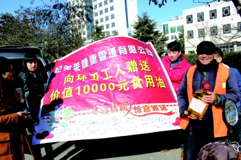 本报2月5日讯(记者 李玉涛) 近几日,市区环卫工人在马路上打扫卫生时,常能收到好心人送的大豆油。送完之后,他们便驱车离开。5日上午,爱心人士在泰安路送油时,记者遇个正着。原来,这是一家爱心企业。近期,他们打算为环卫工人送300桶大豆油。