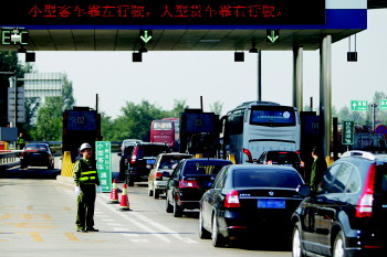 在滨莱高速淄博新区收费站,工作人员疏导车辆上高速(资料片)。