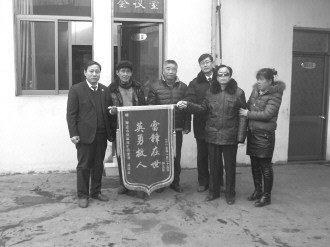 郝先生(戴墨镜者)和家人给孟现全工作的煤矿送来锦旗。 本报通讯员 王伟 摄