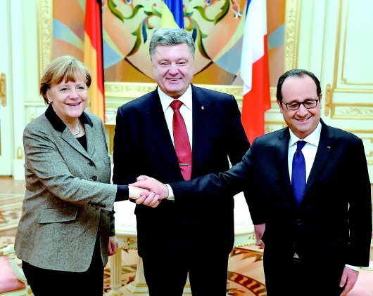 6日,法国总统奥朗德和德国总理默克尔飞抵莫斯科,开始访问俄罗斯并会晤普京,继续就法德两国草拟的乌克兰危机新和平方案作斡旋。此前一天,二人到访乌克兰并会晤乌总统波罗申科。这被视作欧盟国家领导人迄今为结束乌克兰冲突而作出的最大外交努力。