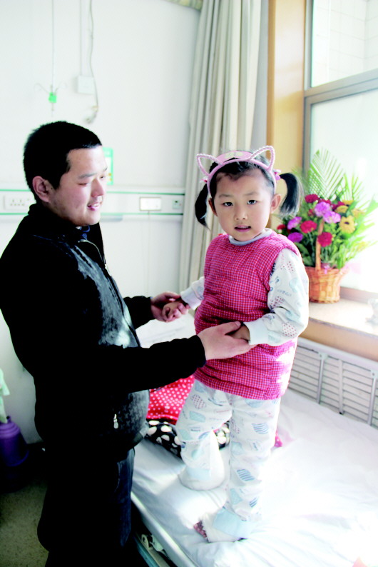2月8日,记者再次来到省立医院病房。宇彤白色的病号服外面套了件红色的棉坎肩,小脸红润了很多,右腿和左脚虽还缠着厚厚的绷带,脸上却挂满笑容。
