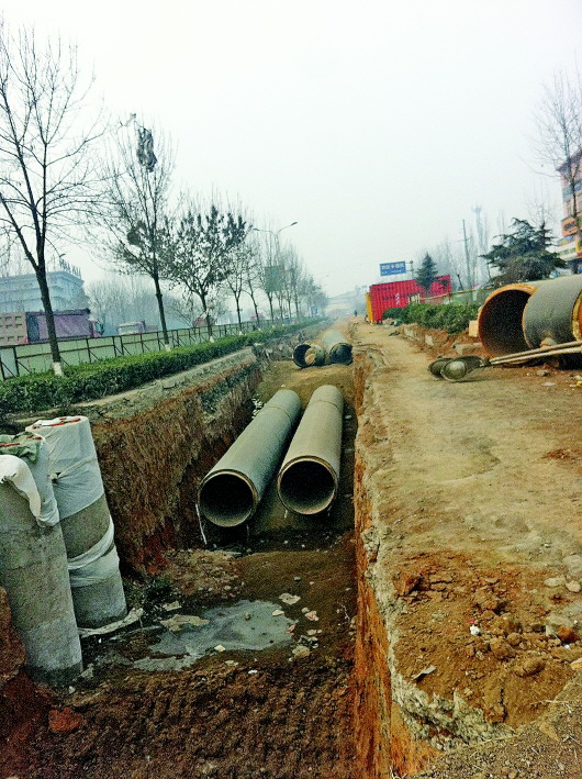 记者看到,工业北路从机场路到章丘的整条路段被挖了一条宽约4米的大坑,以庚辰钢铁为界,以西的路段热力管道已经铺设完成,并且铺上了黄沙,但仍就有1米多深没有进行回填;庚辰钢铁以东的路段还没有铺设管道,挖开的坑大约有3米深,许多地方由于土质比较疏松,用铁板固定着。大坑两侧都用铁板隔离着,大约每隔500米会有一座便桥让车人通行,许多绿化带都已被破坏。