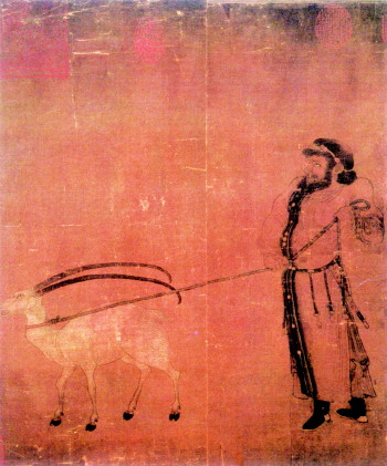 执贡图,也称职贡图,是封建时代外国及中国境内的少数民族上层向中国皇帝进供的纪实图画。我国现存最早的《职贡图》是南北朝时代梁元帝萧绎所画。今日介绍的《蛮夷执贡图》则是曾著录于《宣和画谱》,并收存宋、金内府,后装成册页为清宫《集古图绘》之中的一幅名画。作品中一位胡服使者牵着一只长角羊,非常虔诚地向大唐进贡。这只羊体型秀美,体色灰白、毛发细腻,羊角细长,略向后弯,神态自若,十分高贵。整幅画面晕染细腻,笔法自然,很好地反映了唐代人物画和动物画的面貌。