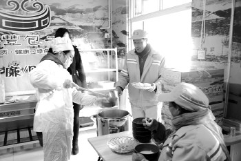店员正在为环卫工人盛粥。 本报记者 公素云 摄