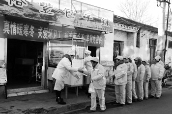 环卫工人排队领取免费的包子。本报记者 公素云 摄