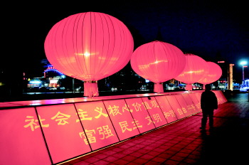 今年的彩灯安装更加节俭,新世纪广场只用300余个灯笼。没有了繁杂的大型造型,简洁个性的灯饰让主题更加鲜明。这些印着时代内涵的大红灯笼得到了不少市民赞许,不少市民从远处专门赶来一饱眼福。“灯笼上印上弘扬正能量的字,每个灯笼都代表着一种精神,这灯笼更有看头儿啦。”市民孙大爷说。