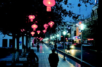 新世纪广场上,大红灯笼亮起来。本报记者 李岩松 摄