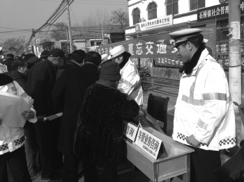 6日,太白湖新区交警大队民警来到石桥镇,为集市上的村民送去了交通安全知识和春联。 本报记者 孟杰 通讯员 李靖 摄