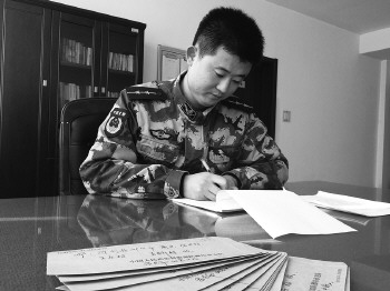 李福来伏在桌上一笔一划地给战士家长们写信。