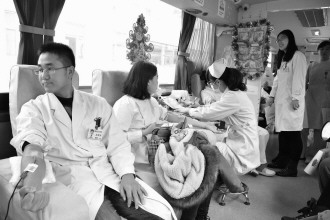 6日,威海市立医院的医务工作者及后勤人员集体献血,从年轻的实习护士到资深医生,207人共计献血63500毫升。